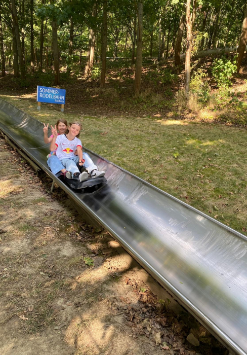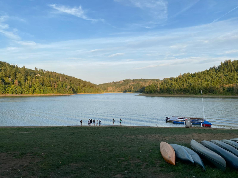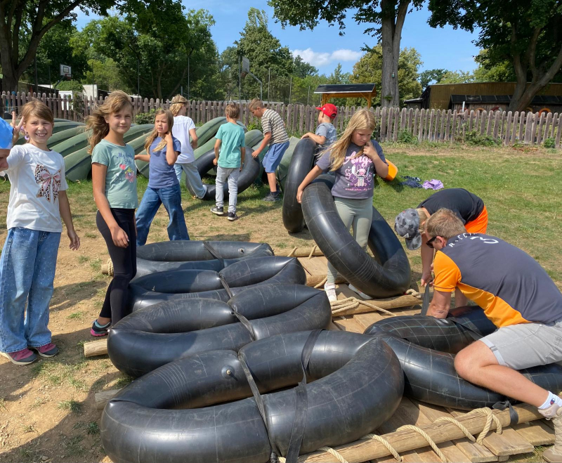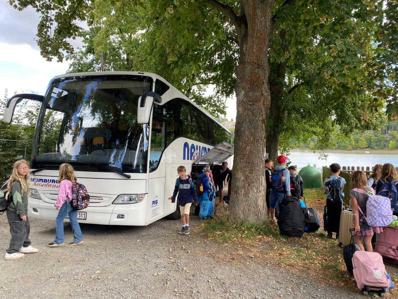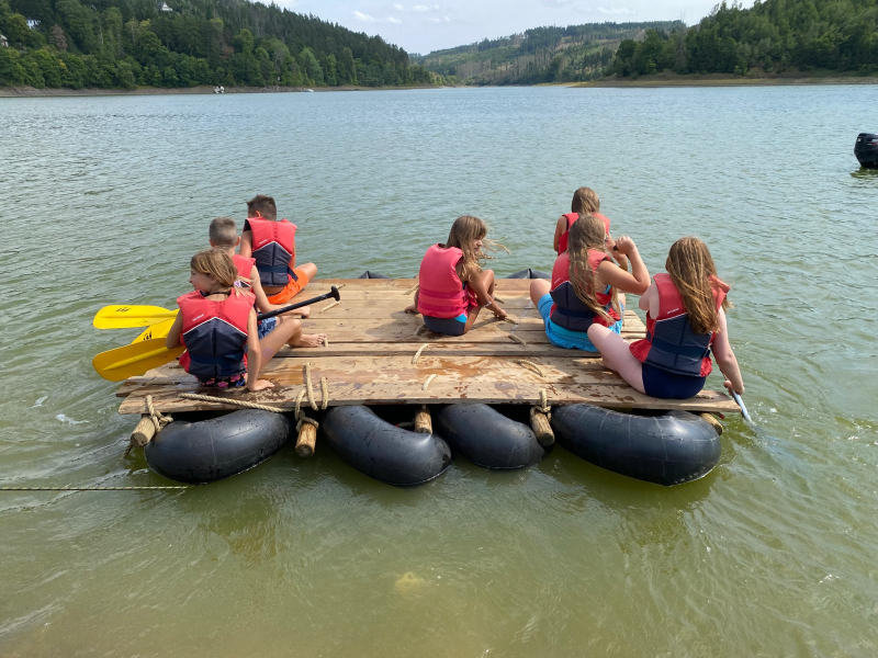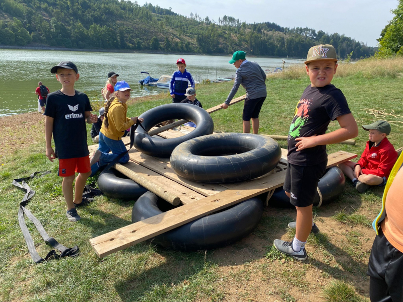 Am Mittwoch trafen wir uns alle an der Bushaltestelle. Viele waren sehr aufgeregt. Um 8:30 Uhr ist der Bus nach Saalburg losgefahren. Dort sind wir 9:30 Uhr angekommen. Zuerst haben wir die Betten in unseren Bungalows bezogen. Zum Mittag gab es Fisch mit Soße und Kartoffelbrei. Dann sind wir 3 km zur Rodelbahn gelaufen. Dort hatten wir viel Spaß. Anschließend gab es noch ein Eis und wir spielten auf dem Spielplatz. Es war sehr heiß draußen. Zur Abkühlung durften wir in der Bleilochtalsperre baden. Zum Abendessen gab es leckeren Burger. Die Disco fing um 20:00 Uhr an ging bis 22:00 Uhr. Am nächsten Morgen sind wir schon sehr früh aufgestanden. Wir haben das Frühstück sehr genossen. Danach starteten wir mit den Floßbau. Zwei Gruppen bauten ein Floß aus Brettern, Seilen und Gummireifen. Dann gab es Nudeln mit Tomatensoße. Nach dem Mittag trugen wir das Floß ins Wasser und durften es ausprobieren. Am Nachmittag haben wir ein Ballturnier gemacht. Nach dem Abendessen haben wir Lagerfeuer gemacht und Stockbrot gegrillt. Freitag mussten wir 07:30 Uhr aufstehen. Nach dem Frühstück haben wir Sachen gepackt und Zimmer aufgeräumt. 10:00 Uhr war die Abfahrt in Saalburg und um 11:00 sind wir in Osterfeld angekommen.