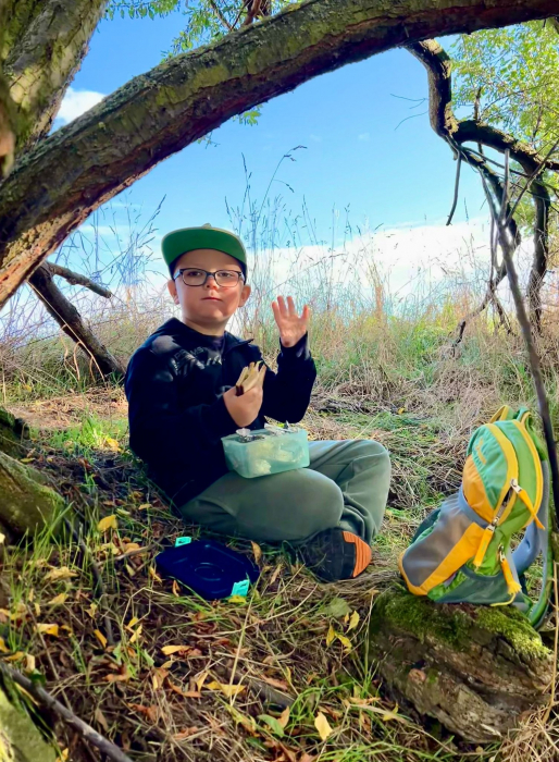 Gesagt - getan! So machten sich die Kinder der 1. und 2. Klasse mit ihrer Klassenlehrerin und der Schulsozialarbeiterin Frau Matthes am 15. September auf den Weg, einen schönen Platz zum Picknicken zu suchen. Vorbei am Gelände von Röckelein und immer Richtung Wald war nach 45 Minuten der perfekte Platz für ein Picknick gefunden. Unter einem alten Baum suchten sich alle ein nettes Plätzchen. Einige Kinder saßen auf Decken oder Jacken. Einige saßen sogar im Baum, welcher abgebrochen und teilweise umgestürzt war. Es wurden sogar die mitgebrachten Regenschirme zu Sonnenschirmen umfunktioniert und so eine kleine Bude zum Frühstücken gebaut.