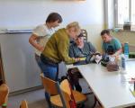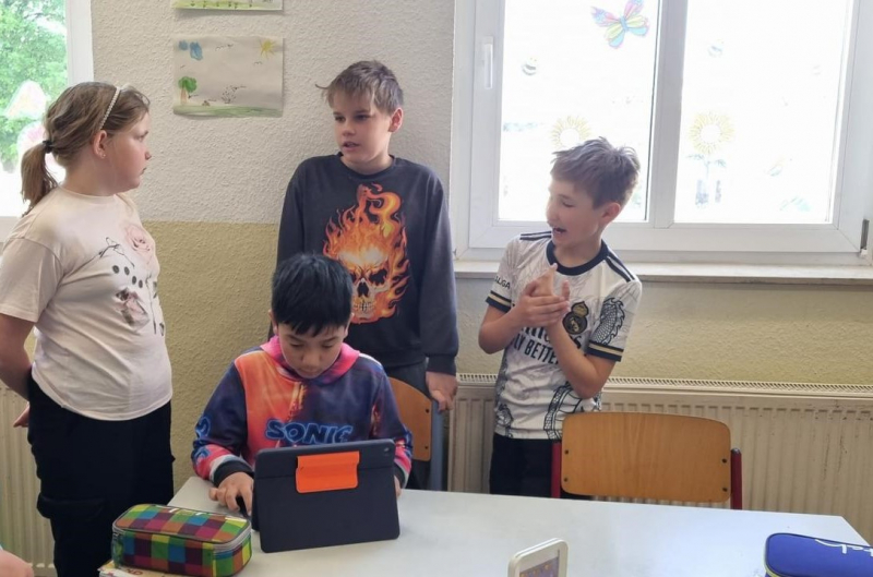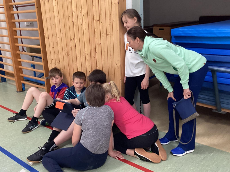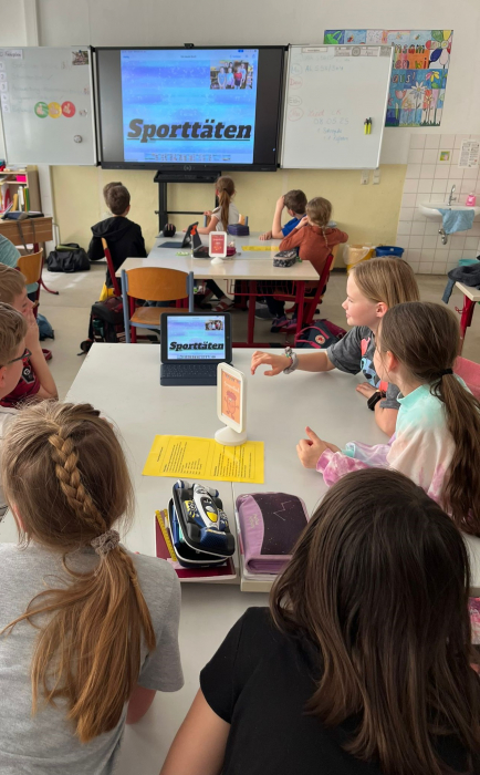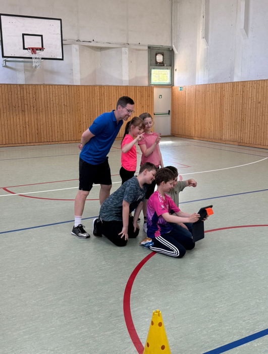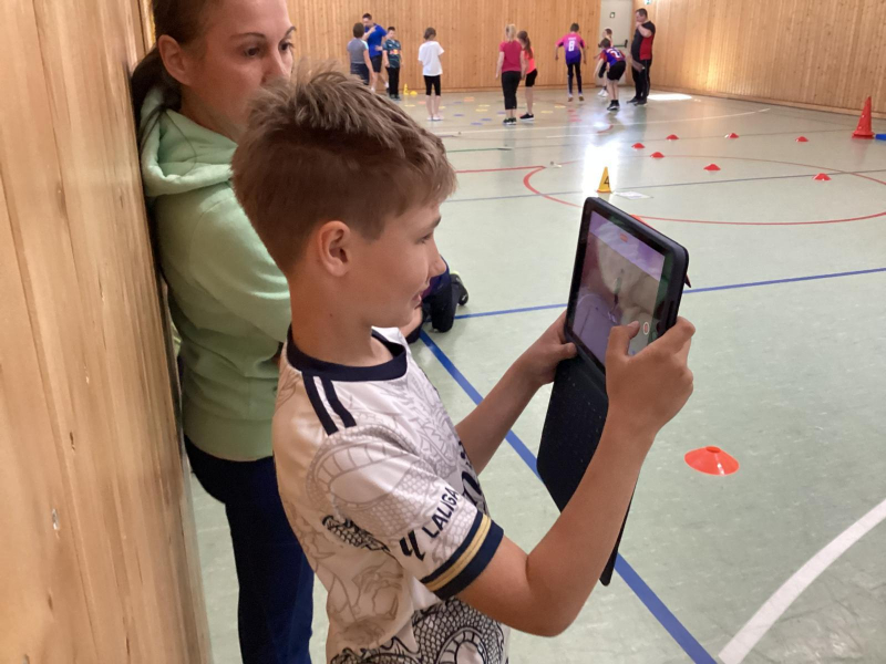 Im Rahmen einer Fortbildung erprobten die Mädchen und Jungen der 4. Klasse zusammen mit ihrer Klassen- und Sportlehrerin Frau Schätzke sowie drei weiteren Lehrkräften den Einsatz digitaler Medien im Sportunterricht.