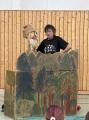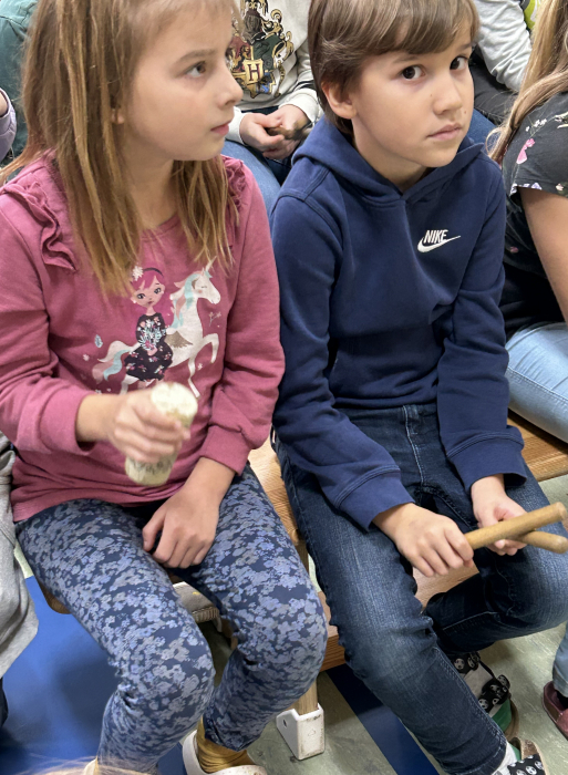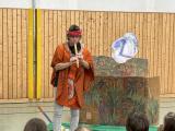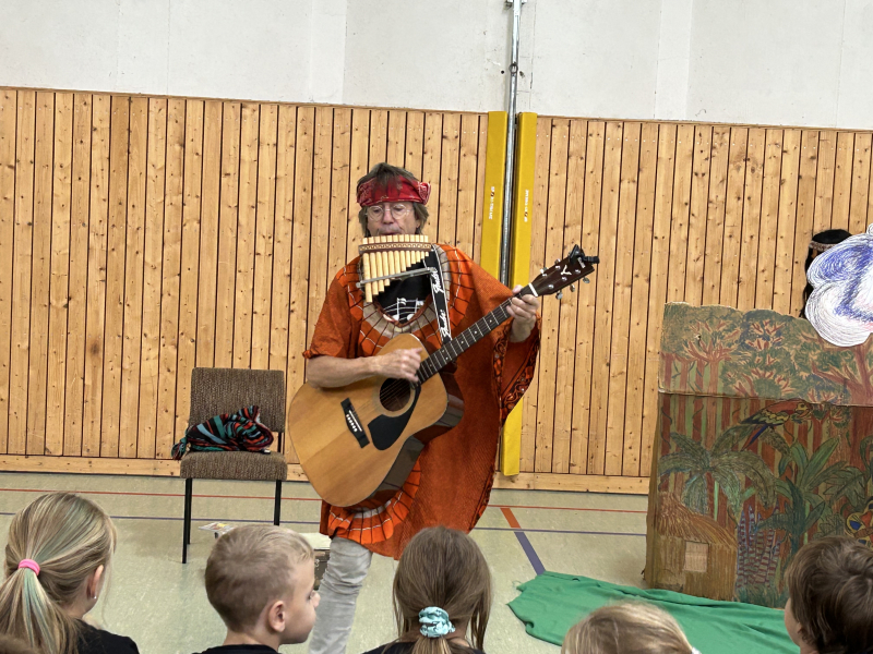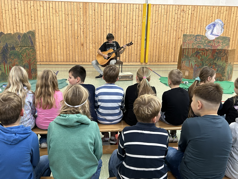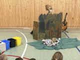 Aufgebaut war eine Waldlandschaft. Herr Zschiesche verwandelte sich wieder in Ricus, der mit Gitarre und Gesang durch das Programm führte. Zunächst traf er einen alten Waldbewohner, der sehr traurig über den vielen Müll war. Die Kinder lernten schnell, dass Wald Leben bedeutet und wir den Wald sauber halten müssen. Im Anschluss entführte uns Ricus in den Regenwald mit exotischen Klängen und allerlei Wissenswertem. Auch hier trafen die Schülerinnen und Schüler auf einen Ureinwohner, der mehr über den Nutzen des Regenwaldes erzählte. Mit Instrumenten aus Wegwerfmaterial begleiteten die Kinder die Reise.