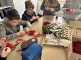 Gegen 18 Uhr gab es dann Pizza für alle und im Anschluss begann das magische Programm. Ein Dieb hatte sich die Klassenkuscheltiere Wolfi, Filo und Leo geschnappt und versteckt. Dank einer Sprachnachricht von einem Zeugen konnte die Kinder einen kleinen Tresor und Aufgaben zum Knacken des Codes finden. Alle machten sich eifrig an das Lösen der kniffeligen Aufgaben. Nach einer Weile war der Code geknackt und der Tresor geöffnet. Dort befanden sich aber nicht die Klassenkuscheltiere, sondern ein Schlüssel und ein weiterer Hinweis. Schnell kombinierten die Mädchen und Jungen alles und fanden schließlich Wolfi, Filo und Leo in der Bibliothek. Dort war auch eine Kiste mit Perlen und Wolle, denn alle sollten für sich und ihr Kuscheltier ein magisches Armband basteln, um zu zeigen, dass sie zusammengehören.