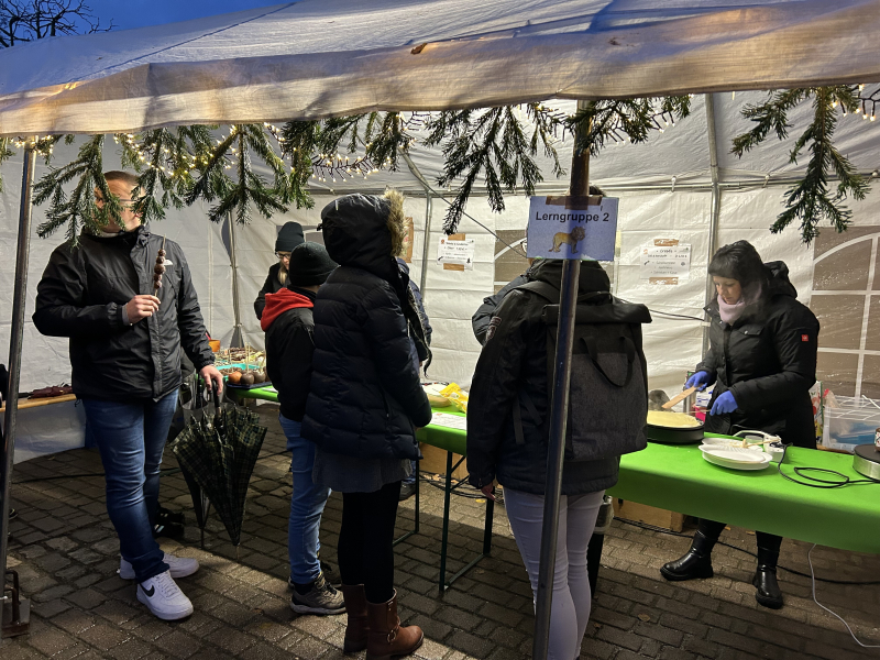 Während das Programm lief, füllten die Eltern ihre Stände mit allerlei Leckereien und selbst Gemachtem. Es roch nach Waffeln, Glühwein, Bratwurst und Pommes. Es gab Eierlikör, Marmelade und Baumscheiben mit Meisenknödeln zu kaufen. Für Jeden war etwas dabei und alle Einnahmen kommen den Kindern der Grundschule zugute. In diesem Jahr wurde für die Tanzprojektwoche und die Schulbibliothek gesammelt. Obwohl das Wetter nicht so richtig mitspielen wollte, war der Adventsmarkt ein Erfolg. Die Kinder zauberten Weihnachtsstimmung auf den Schulhof und wir freuen uns auf den nächsten Adventsmarkt.