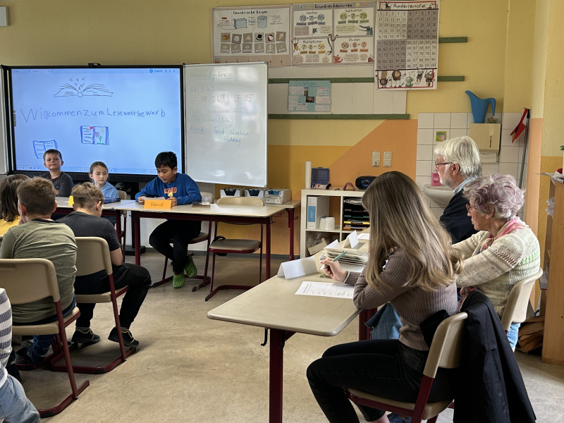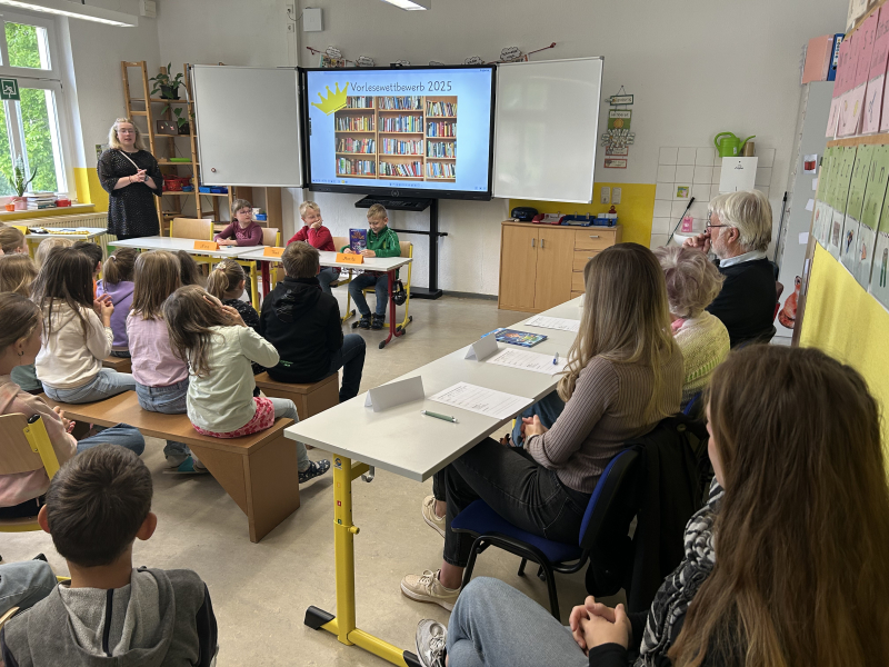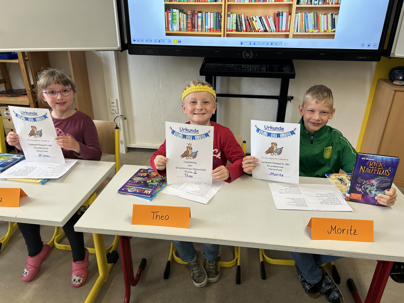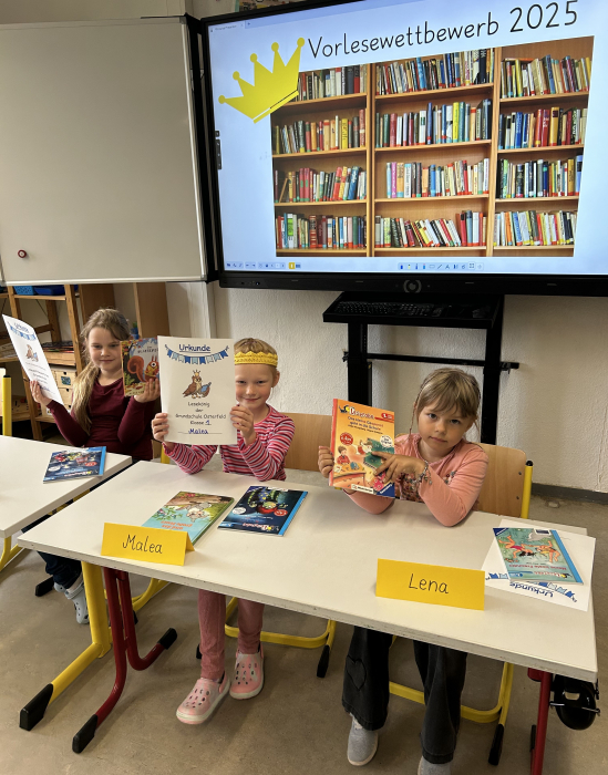 Die fachkundige Jury - bestehend aus Frau Schumann (ehemalige Schulleiterin), Frau Otto (Lesepatin) und Herrn Seidel (ehemaliger Lehrer) - war begeistert von allen Lesebeiträgen und konnten sich nur schwer entscheiden, wer die Krone in Klasse 1 und 2 verdient hatte. Wir gratulieren Malea aus der 1. Klasse und Theo aus der 2. Klasse zum Sieg.