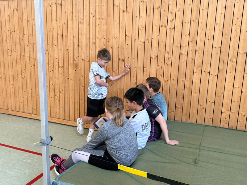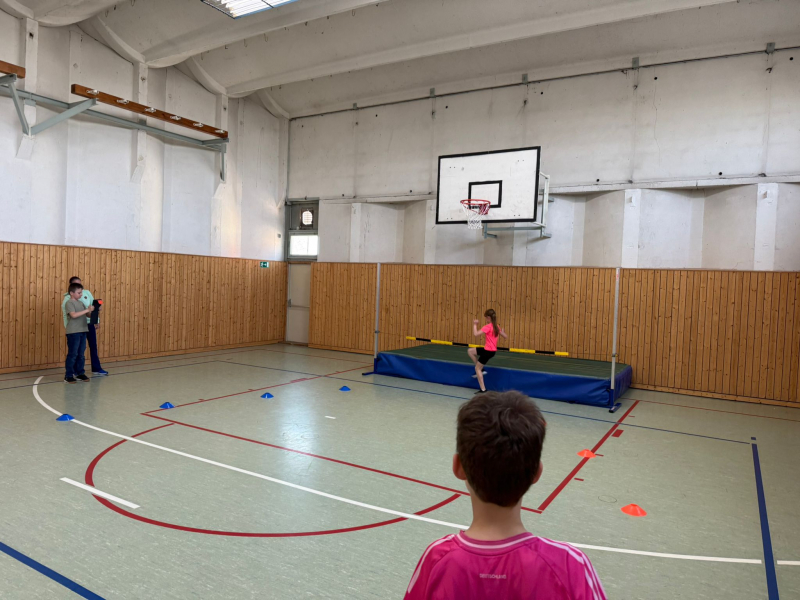 Die Kinder beschäftigten sich mit dem Hochsprung und der passenden Technik für jeden Einzelnen. Zunächst bekamen alle eine Einführung zum Computerprogramm im Klassenraum. Dann ging es in die Turnhalle. Nach einer kurzen allgemeinen Erwärmung starteten die ersten Versuche über die Hochsprunglatte. Ein Teammitglied filmte immer den Versuch. So wurde die Ausgangslage dokumentiert. Viele Mädchen und Jungen waren recht unzufrieden mit ihren Ergebnissen.