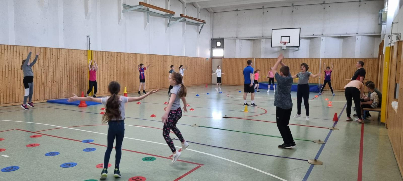 Anschließend begann ein Stationstraining zur Verbesserung der Hochsprungtechnik. Dank des Trainings und der Analyse der ersten Sprünge konnten viele Kinder kleine Fehler verbessern und größere Höhen überspringen. Bei einem Mädchen half der Austausch in der Gruppe sogar so gut, dass sie plötzlich von links anlief, besser absprang und so einen großen Erfolg feiern konnte.