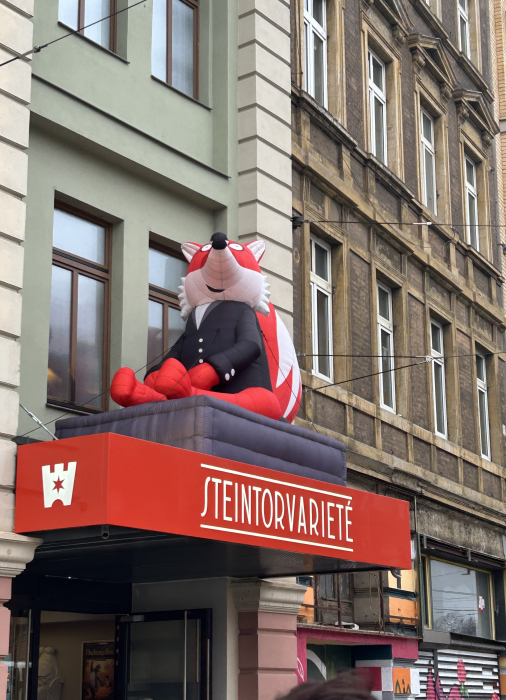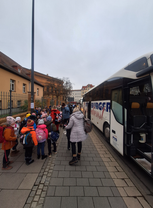 Am 12. Dezember fand unsere traditionelle Theaterfahrt statt. In diesem Jahr ging es aber nicht nach Naumburg, sondern nach Halle/Saale. Die Kinder durften sich die Weihnachtsrevue "Herr Fuchs, Felix und die Weihnachtsprinzessin" im Steintor Varieté anschauen. Alle Kinder waren sehr aufgeregt, denn das Theater in Halle war ein besonderes Ziel. Mit drei großen Reisebussen der PVG ging es morgens los. In Halle angekommen, stärkten sich die Mädchen und Jungen noch und naschten das Frühstück aus ihren Brotdosen. Danach ging es ins Steintor Varieté.