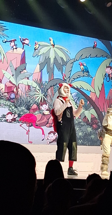 Nachdem jeder seinen Platz gefunden hatte, wurde es auch schon dunkel im Saal. Eine große Diskokugel begann zu strahlen und die Augen der Kinder wurden immer größer. Mit viel Musik, Tanz und lustigen Dialogen sorgten die Hauptdarsteller und die vielen Tanzkinder für super Stimmung. Alle Mädchen und Jungen sangen, klatschen und tanzten sogar ein wenig.