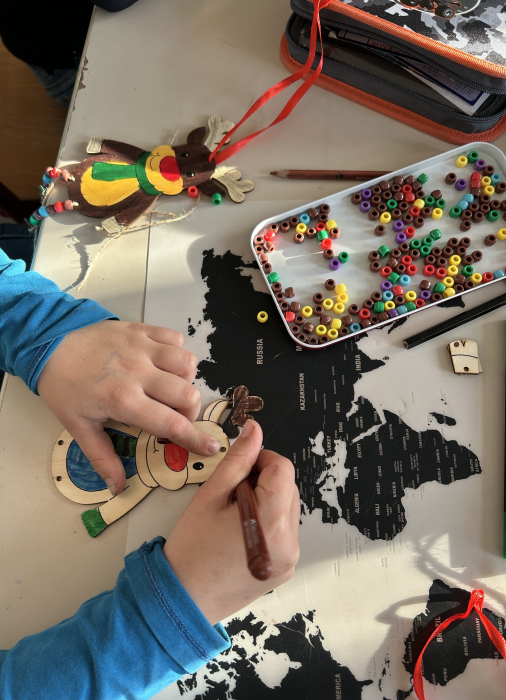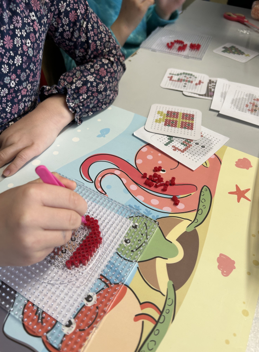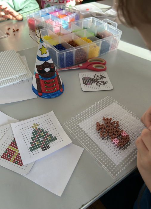 Besonders beliebt war die Arbeit mit Bügelperlen. Es wurden aber auch Tannenbäume aus Kreisen, Engel aus Zeitungspapier Holzelche mit Perlenbeinen hergestellt. Alle Kinder hatten viel Spaß und konnten stolz auf ihre Bastelarbeiten sein. Der Heiligabend wird sicher erfolgreich mit den bunten Geschenken.