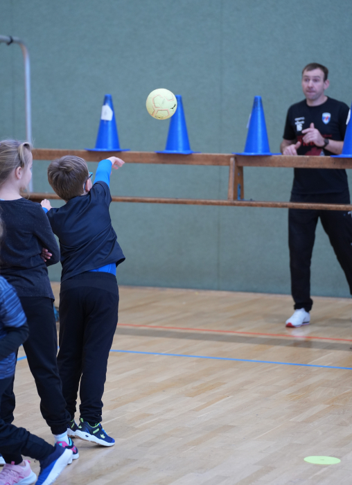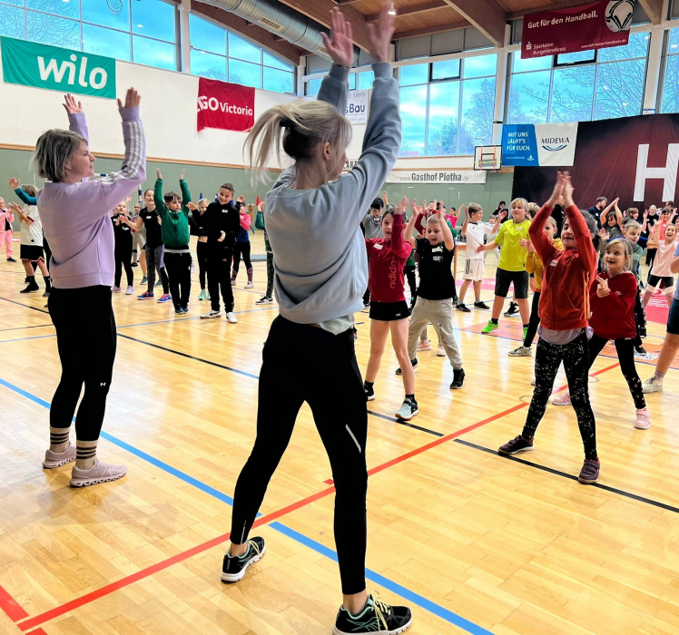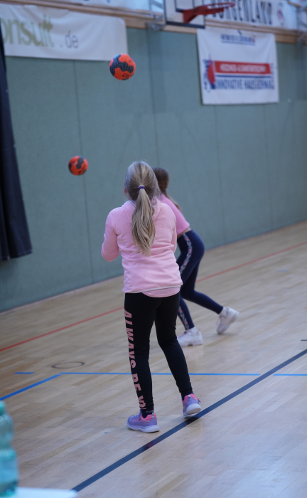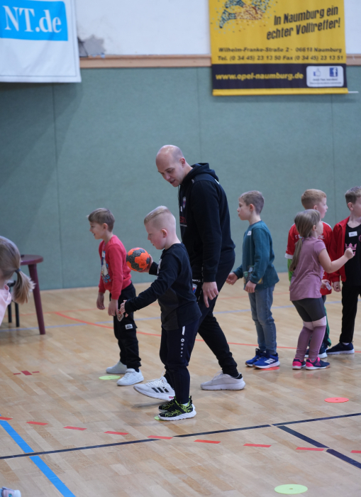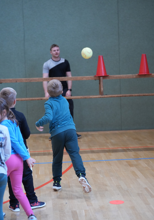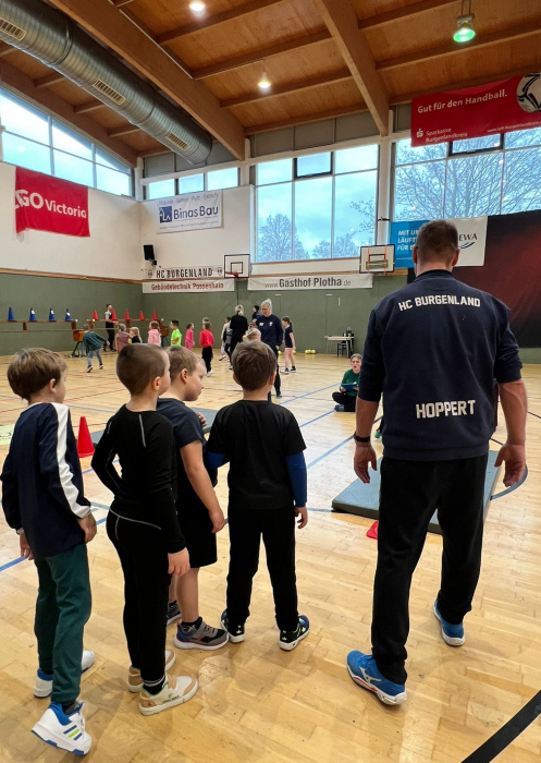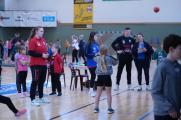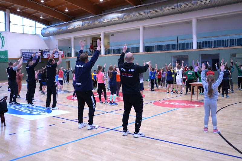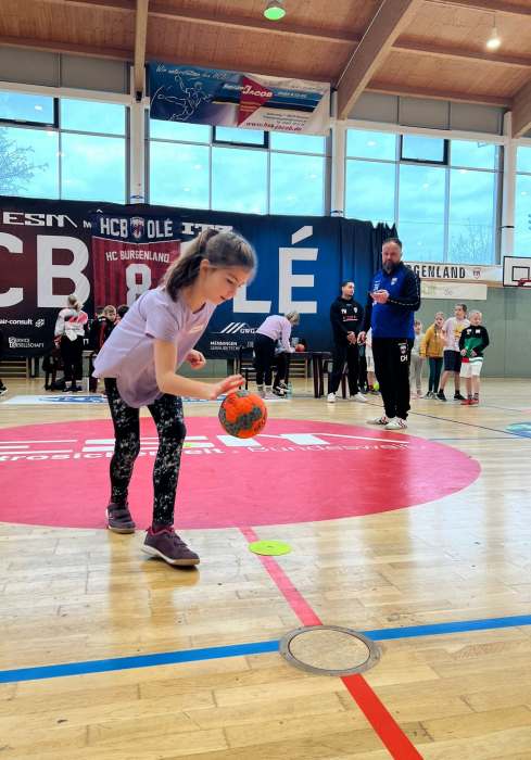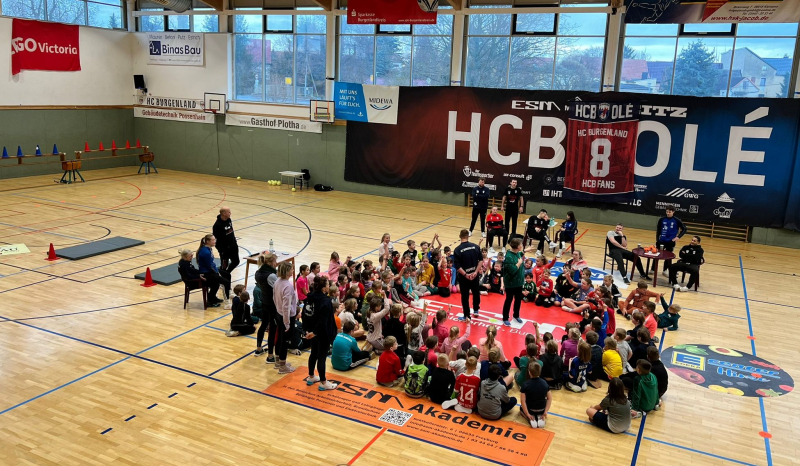 Während die Kinder frühstückten, bauten die Trainerinnen, Trainer, Spielerinnen und Spieler des HC Burgenland bereits die fünf Stationen für den Grundschulaktionstag auf. Dieser Aktionstag ist eine Initiative des Deutschen Handballbundes in Zusammenarbeit mit den jeweiligen Landesverbänden. In diesem Jahr nahmen nun also die Grundschülerinnen und Grundschüler daran teil und konnte dank des Engagements des HC Burgenland sogar in der Heimstätte ihr Können zeigen.